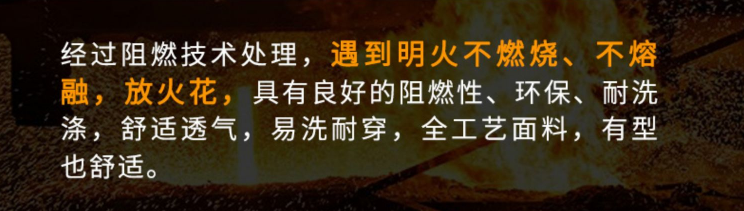 特殊工藝織造而成,用此種面料經特殊縫紉工藝制成的阻燃服裝,具有隔熱、反射、吸收、碳化隔離等屏蔽作用,阻燃